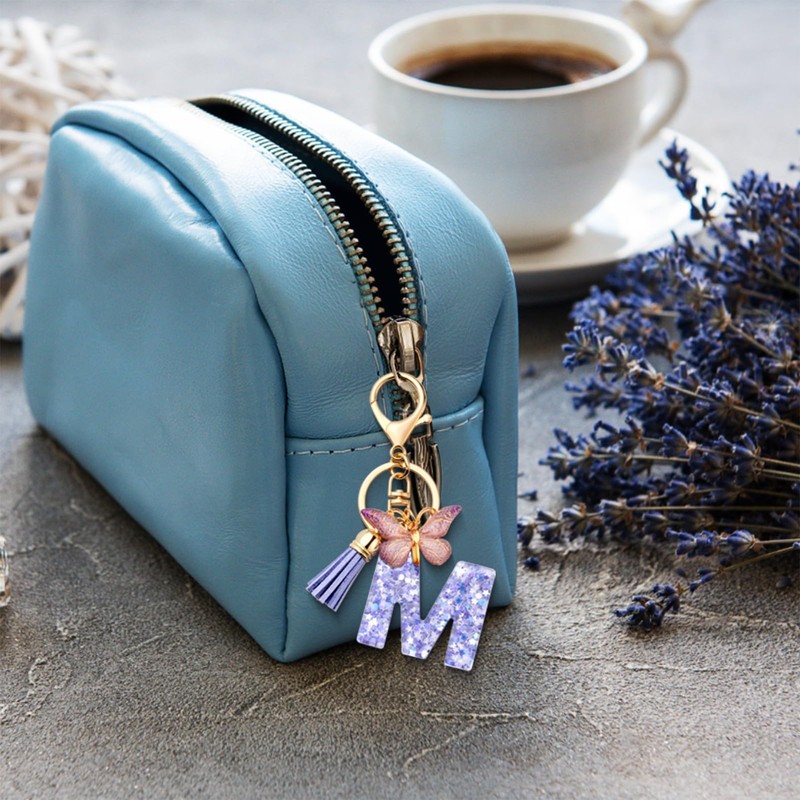 - Cute keychain accessories and charm: meaning initial letter and beautiful tassels. This cute purple butterfly key ring with tassels can be used for keys, purses, handbags, backpacks, bags and car keys of women or girls.