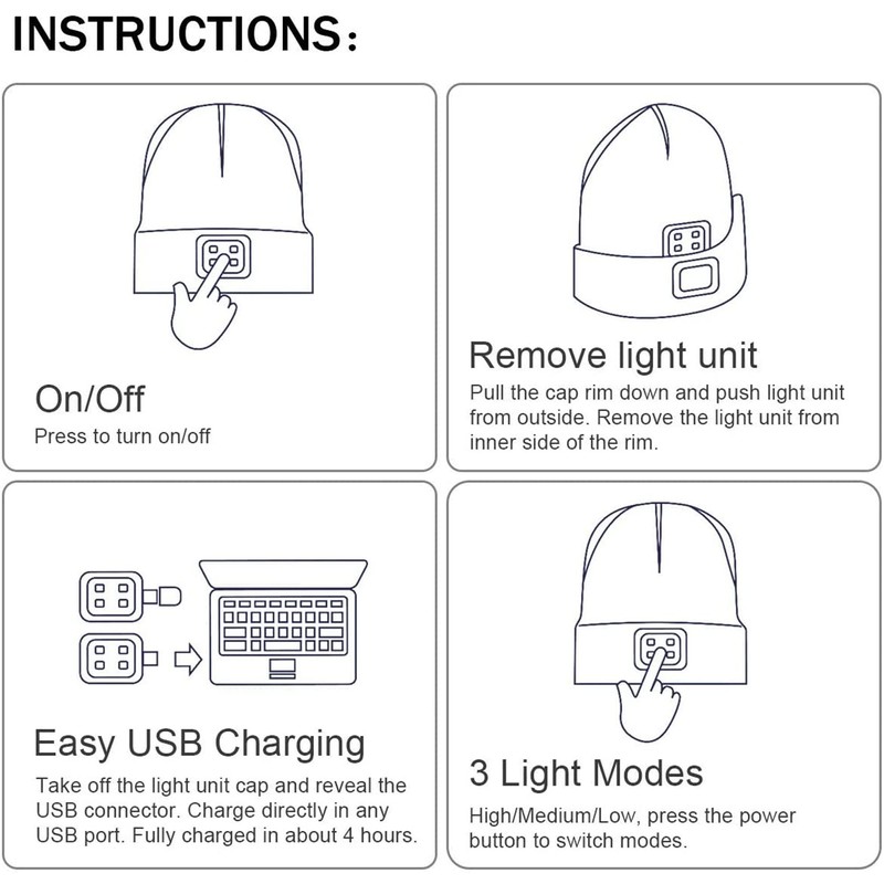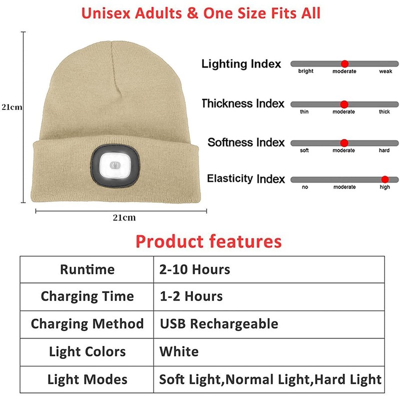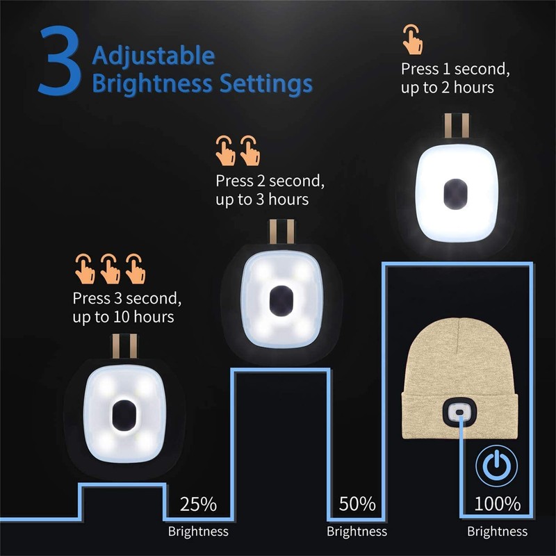 • Convenient charging and washing: you just need to open the edge of the stocking cap and press the light inside to separate it and wash the cap or charge the light. 4 LED lights have a high-quality waterproof protection class IP44. With three (3) adjustable brightness settings, you can have the perfect amount of light for any task.