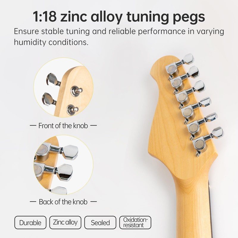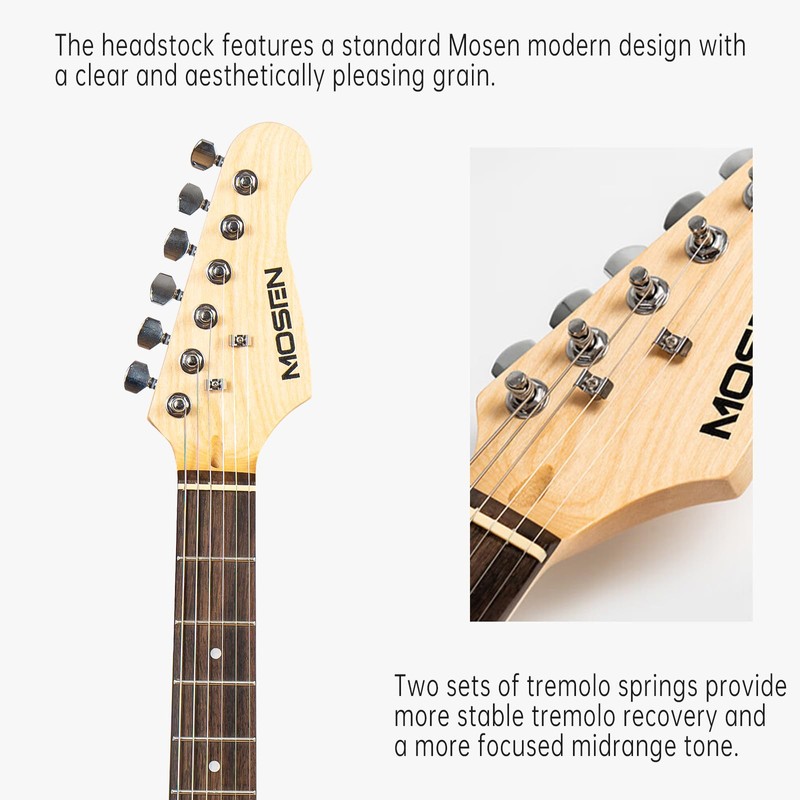 - [Maple Neck with 22 Frets]: The MOSEN beginner electric guitar features a Canadian maple neck with a classic “C” shaped profile for a comfortable fit. It is paired with a Laurel Wood fingerboard and a solid body. The guitar includes 22 copper-nickel frets with clear position markers on both the neck and fingerboard, ensuring smooth playability and ease of use for players of all levels