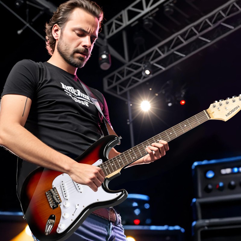 - [Complete All-in-One Package]: No need to purchase additional accessories separately. The MOSEN electric guitar set features a comprehensive kit including a powerful amplifier, a durable nylon carrying case, extra strings, a pick, a whammy bar, and a shoulder strap with an attached pick holder