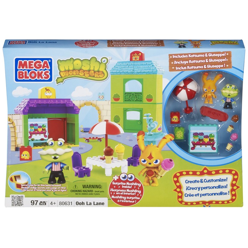 Mega Bloks - Moshi Monsters - Ooh La LaneCreate and customize the fantastic world of Moshi Monsters. Add to your child’s Moshi Monsters collection or start it off right with the Moshi Monsters Ooh La Lane by Mega Bloks. Within this huge 99 piece set are two lovable figures, including Katsuma and Giuseppe Gelato, plus a surprise moshling. Your child can make both monsters build ice cream cones at the Ice Scream Shop on a hot afternoon or use the brightly colored pieces to create Gabby’s Café where they can grab a yummy snack. Build it exactly like it’s shown in the Moshi Monsters online game or your child can design a whole new street in Monstro city. There is no limit to what your child can create with Ooh La Lane. Two secret codes are included to get your hands on fun accessories and items for your child’s online-game fun. Ideal for children ages 4+.