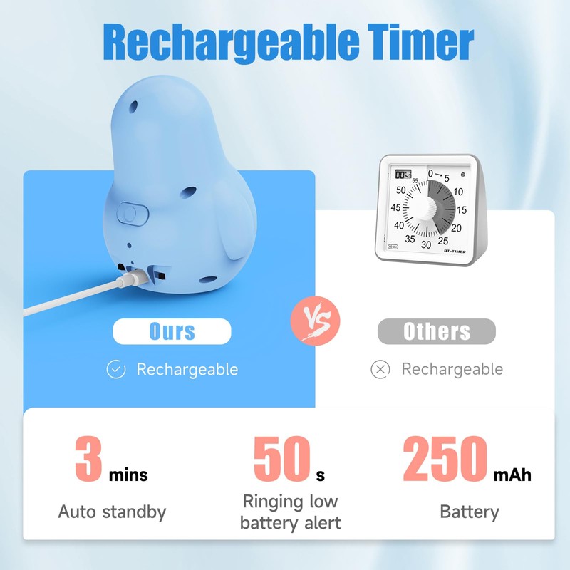 - 🕑【Visual Countdown Timer Clock】Upgraded Rechargeable Pomodoro timer with charging function, built-in 250mAh battery, can be used for three months on a single charge, more convenient to use than battery timers on the market. It has a 50-second low-battery ringtone reminder and an automatic standby function after 3 minutes of inactivity, making our time management more intelligent, come and experience a different timing journey.
