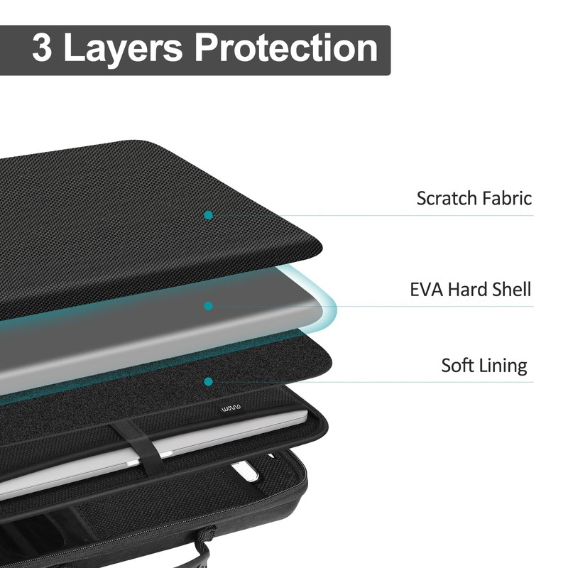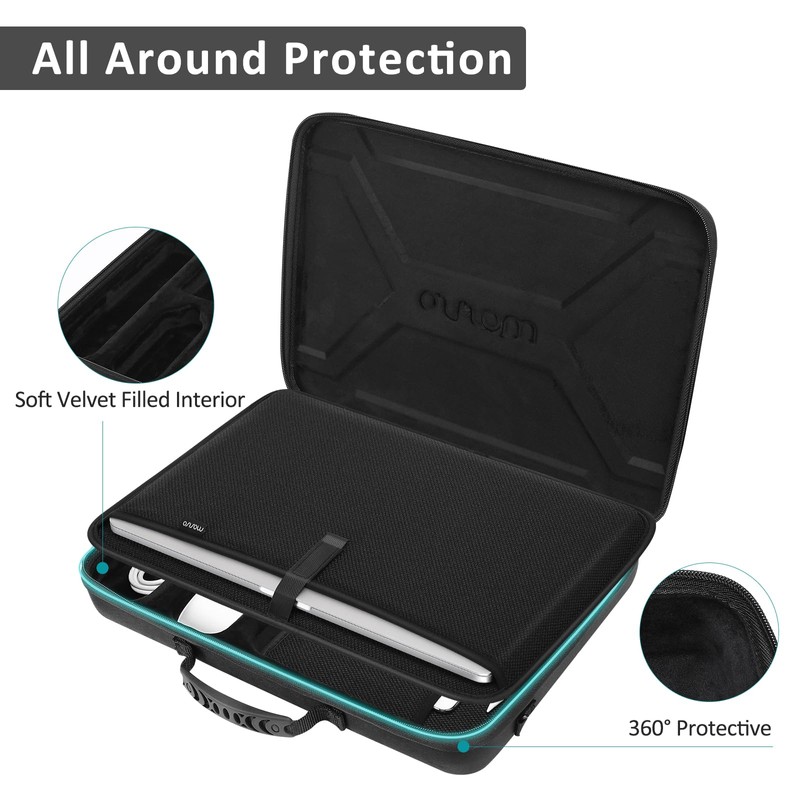 - Made of durable EVA material, shockproof, dustproof and waterproof. Soft velvet filled interior can prevent your stuff from scratch and bumps. The laptop shoulder bag can be fully opened at 180 degree, 2 separate soft pockets for storing your laptop and tablet, easily access your stuff.