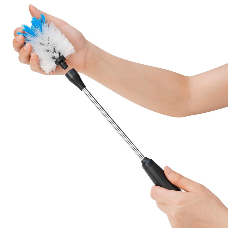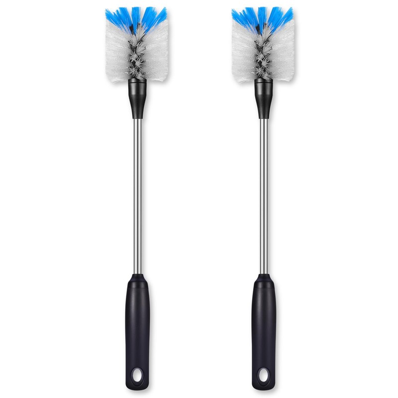 - Dual-Function Bristles: Brush head has two types of bristles for gentle cleaning and serious scrubbing; soft white bristles are gentle enough to wine glasses and crystal without scratching, while the stiff blue bristles on the tip are firmer, give the hard-to-reach corners and bottom of bottles a serious scrub