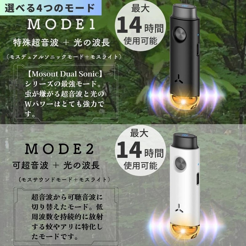 - (Wide Range of Sound and Light Bugs Disappointed) The Mosout Dual Sonic P1 is small, but it diffuses sounds that are disliked by mosquitoes and insects within a range of 170° radiation angles, 6.6 ft (2 m) left and right and 16.4 ft (5 m) forward, protecting you from insects from a wide area