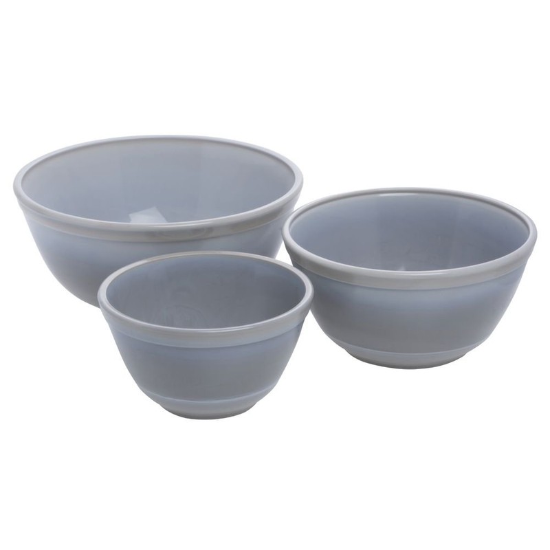 Brighten up you kitchen with these traditional grey marble mixing bowls. The timeless vintage style adds a pinch of country charm to food displays or table settings. The bowls can be used for both mixing and serving. Plus, they nest together for compact storage. The mixing bowl set includes a 20 oz, 40 oz and 65 oz bowl.