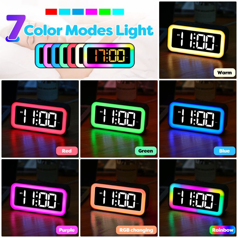 - Dynamic RGB night light and time display: This multifunctional digital LED alarm clock is equipped with 8 modes of dynamic RGB colour changing light and 6 modes of dynamic RGB digital display, just click on the light button at the top, you can choose different colours of the ambient light and digital display. Perfect for children, teenagers or seniors as a bed / night / reading light, a good choice for bedroom decoration