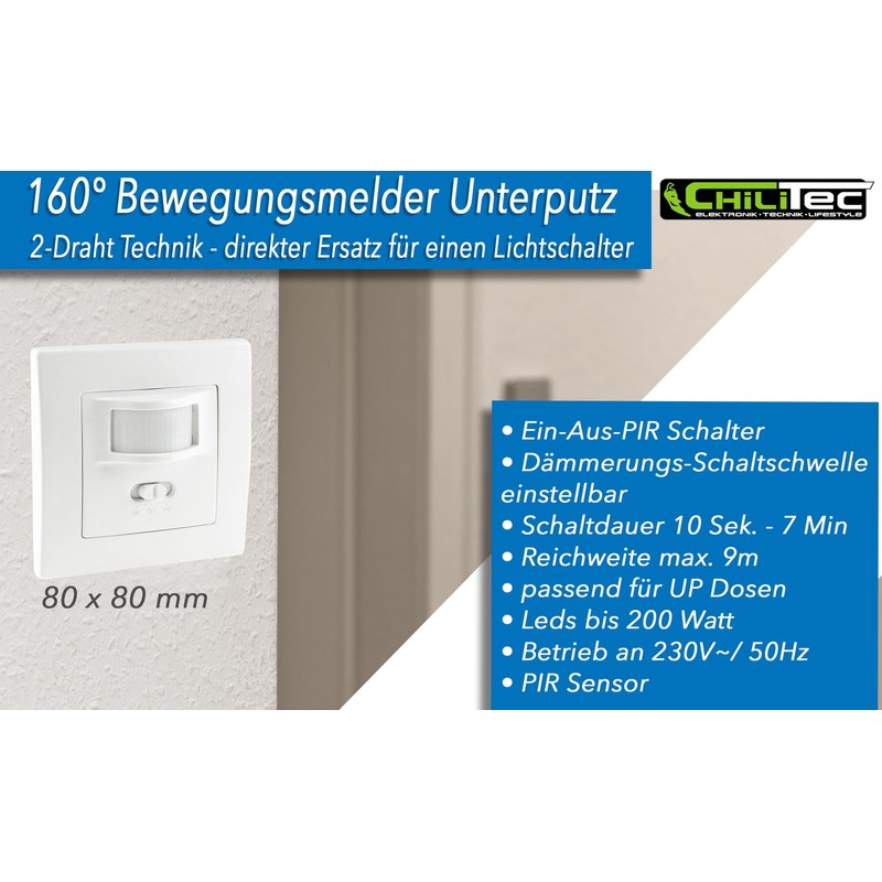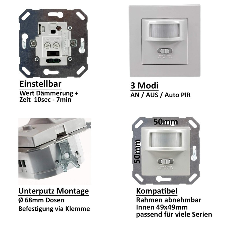 • Twilight switching threshold adjustable, switching time 10 seconds - 7 minutes can be adjusted. Can be mounted in flush-mounted boxes.