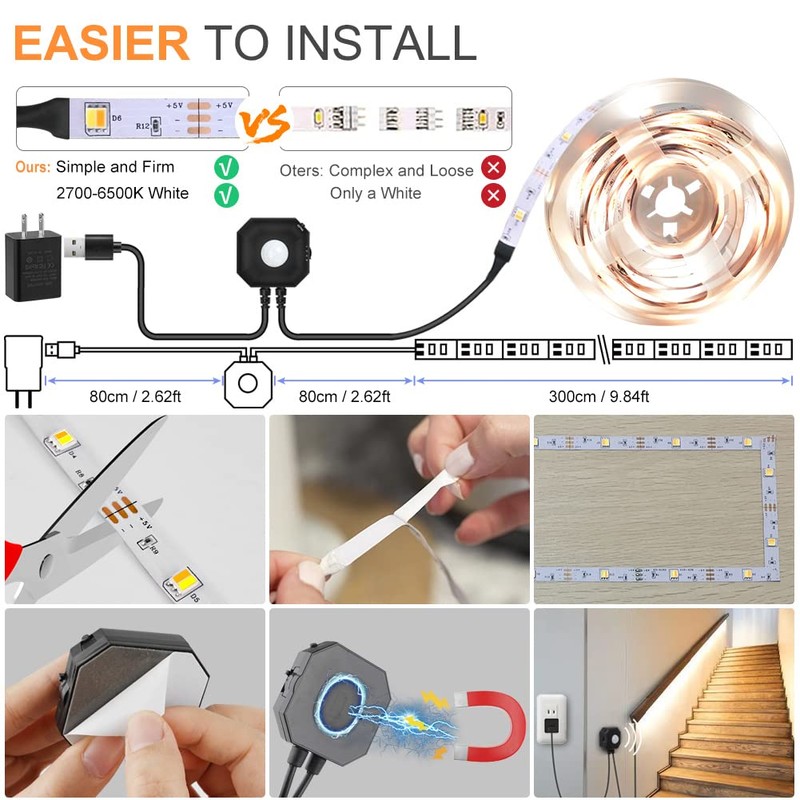 - 【Easy installation】All joints are soldered not detachable any more, plug and play. The sensor box with a built-in magnet to stick on any ironwork. We use professional and strong acrylic adhesive, you don't worry about the strip falling down. The tape is traceless, no need to worry any residue on the surface.