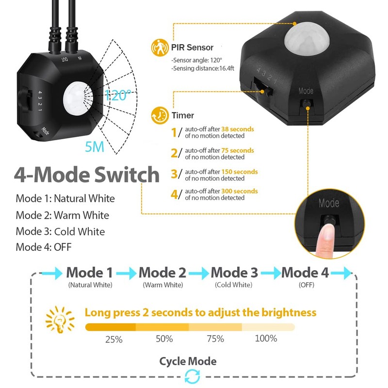 - 【Motion Sensor Night Light】The sensor box has turn on/off, 4 Brightness Levels, 3 level color temperature and 4 timing off option function. Short pressing the Mode button to select level color temperature (Natural White / Warm White / Cold white) Long pressing the Mode button to adjust the brightness (25%, 50%, 75%, 100% brightness). You can freely adjust according to your lighting needs.