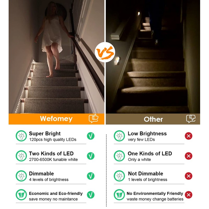 - 【Widely Used Light Strip】This motion sensor light strip with 120 pieces of SMD5025 LEDs. Every 1 led as a unit is with a cutting mark, please cut it according to its cutting mark. Then DIY the flexible led tape light length by connectors. Wefomey white LED strip lights can be used as under cabinet lights, vanity mirror lights, room lights, desk lights and more.