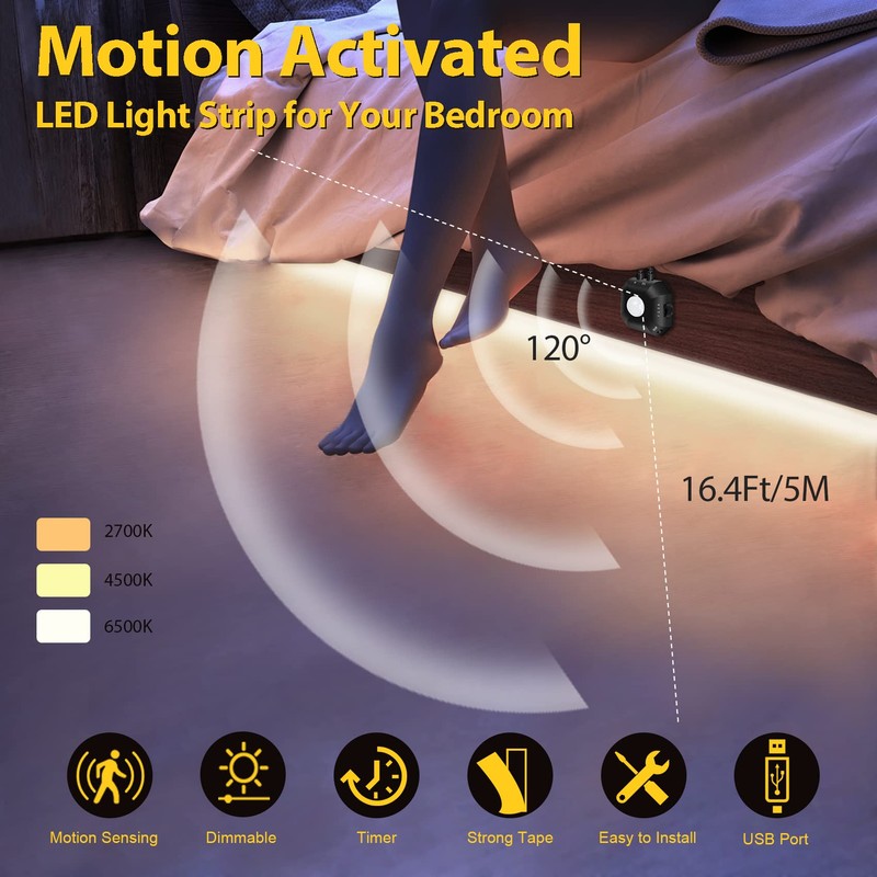 - 【Energy Saving Strip Lights】With passive infrared technology (PIR), it detects human motion. The motion sensor led light strip is auto-on within 16.4ft/5m, auto-off after 38-300 seconds of no motion detected. Super saving energy!