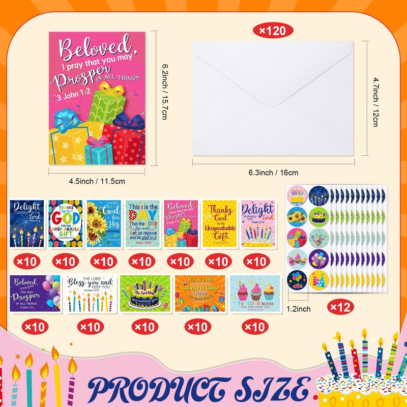 - Abundant Package Contents: experience the convenience of 120 sets of religious birthday cards(12 styles) with 120 white envelopes and 120 stickers(10 styles); With generous quantity and various styles, meet all your greeting card needs for church members, family, and friends