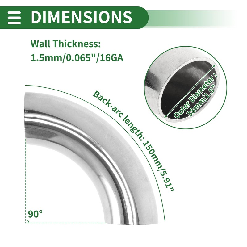 - Feature:Pipe Type: 90 Degree Bend Elbow; Outer Diameter: 38mm/1.5"; Back-arc length: 150mm/5.91"; Wall Thickness: 1.5mm/0.065"/16GA