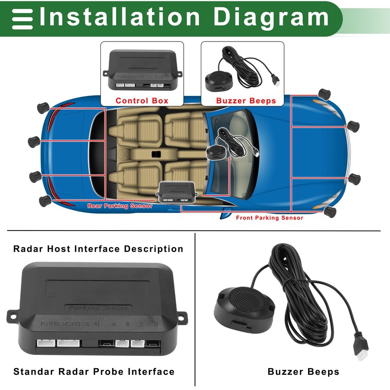 - What You Get:This parking sensor system includes 2 precision sensors, a control box, and a Buzzer Beeps.