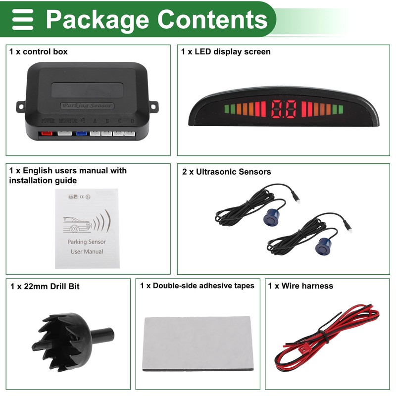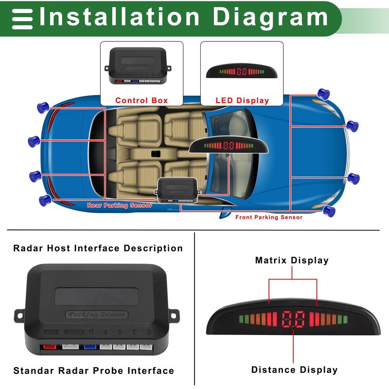 - What You Get:This parking sensor system includes 2 Parking Sensors, a control box, and a LED display screen.