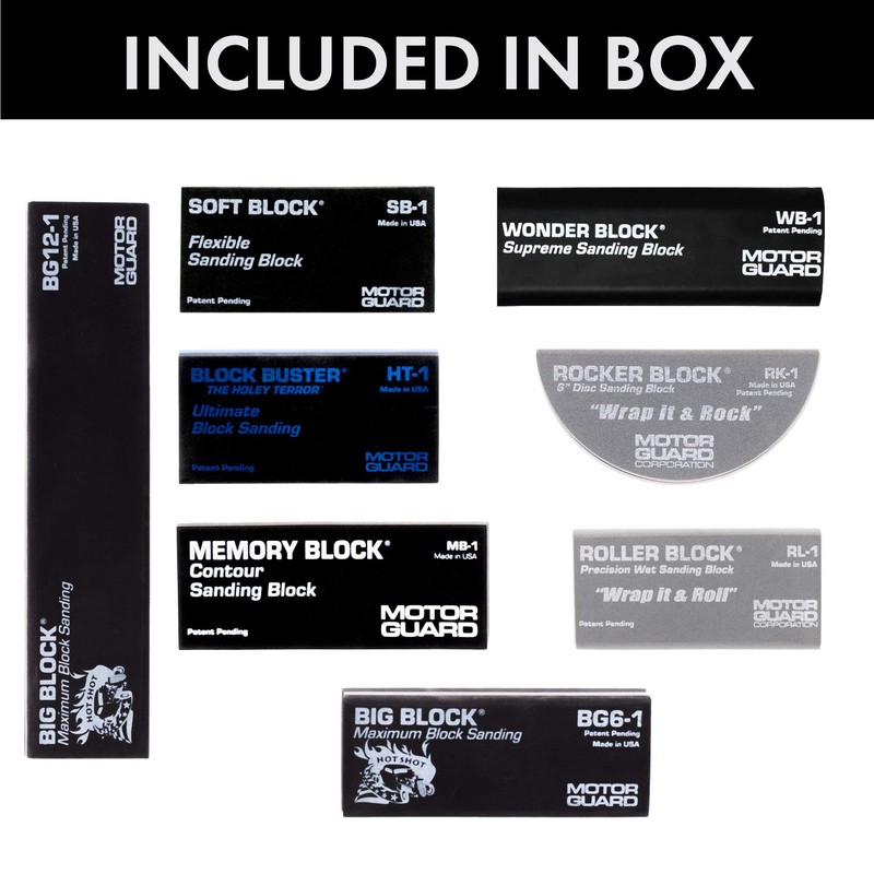 An assortment of eight of Motor Guard's most popular sanding blocks. Includes SB-1, HT-1, MB-1, WB-1, RK-1, RL-1, BG6-1 and BG12-1.