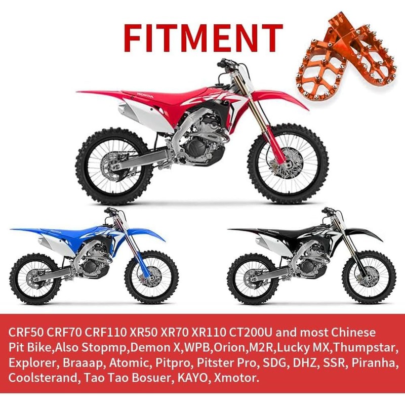 COMPATIBILITY: The JFG Foot Pegs fit for CRF XR 50 70 110 pit bike and most chinese pit bike , also Stomp, Demon X, WPB, Orion, M2R, Lucky MX, Thumpstar, Explorer, Braaap, Atomic, Pitpro, Pitster Pro, SDG,DHZ, Piranha ,Coolsterand ,Tao Tao Bosuer ,KAYO ,Xmotor, Apollo many more Chinese brand.It is a aftermarket products so maybe need little modification on it , make sure you can know that before you buy.