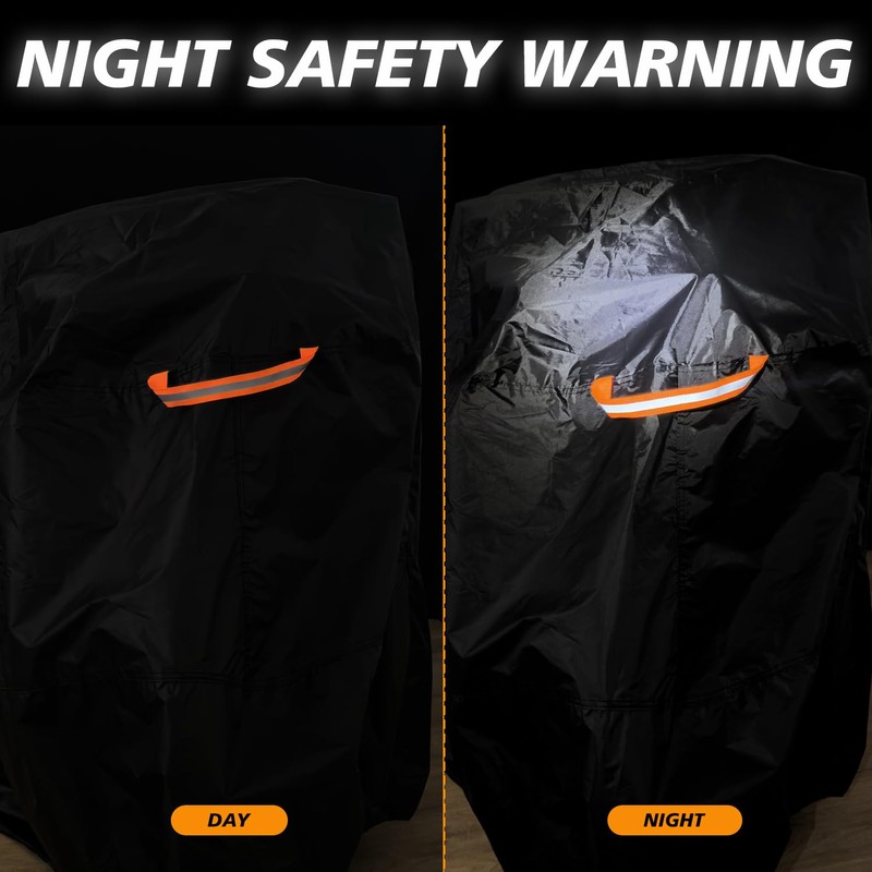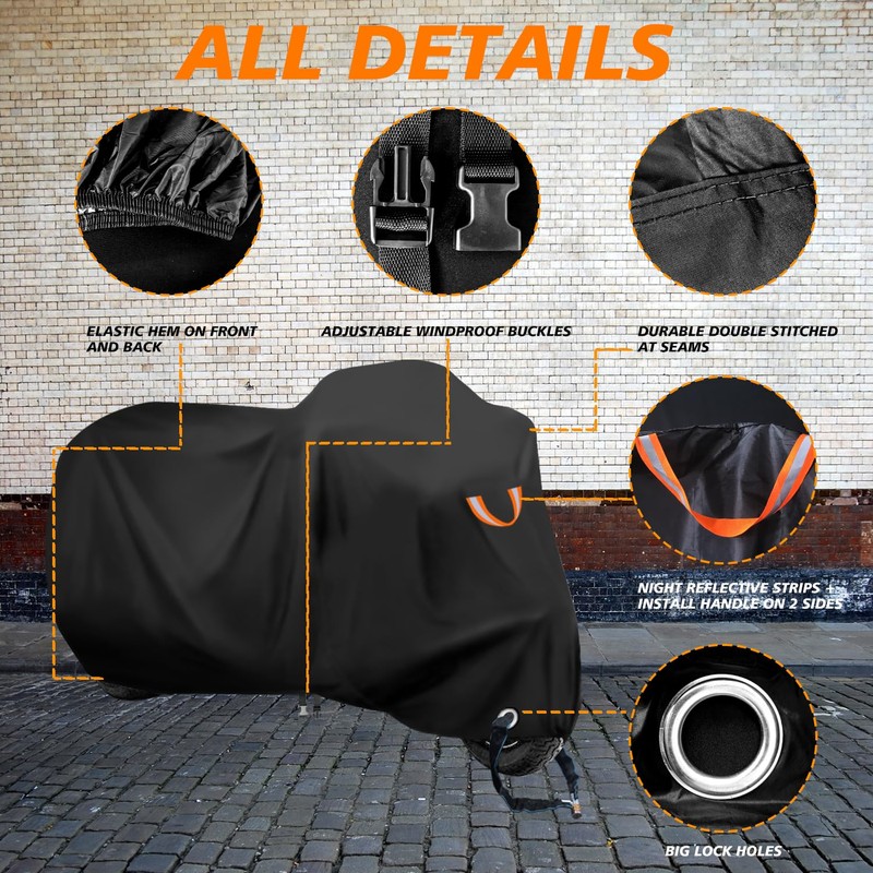 - 5 Details That Matter: 1.Elastic hem on the bottom snug fits for motorcycle like gloves;2.securing 1 windproof buckle straps provide excellent security on high windy days;3.1pcs night reflective stripe and handle warning at night,also help you easy take on and off.4.large anti-rust lock hole for anti-theft.5.Double stitches at seams to make the fabric more difficult to tear
