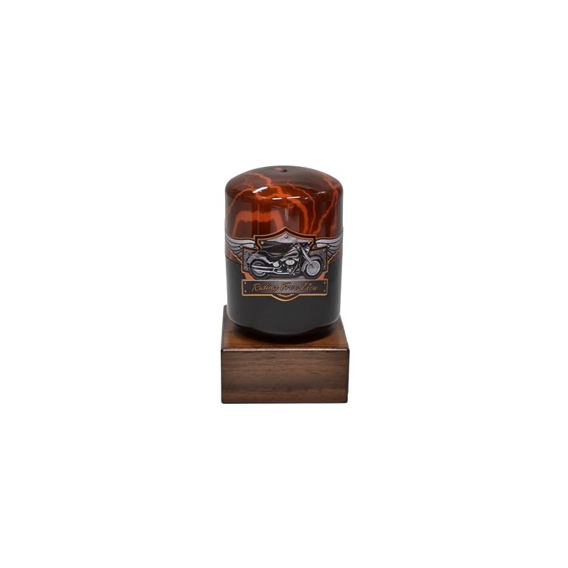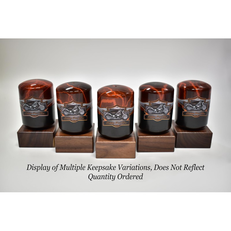 - The included Motorcycle Theme Keepsake measures 1 7/8" in Diameter by 2 1/2" Tall. Splitting in half for easy access.