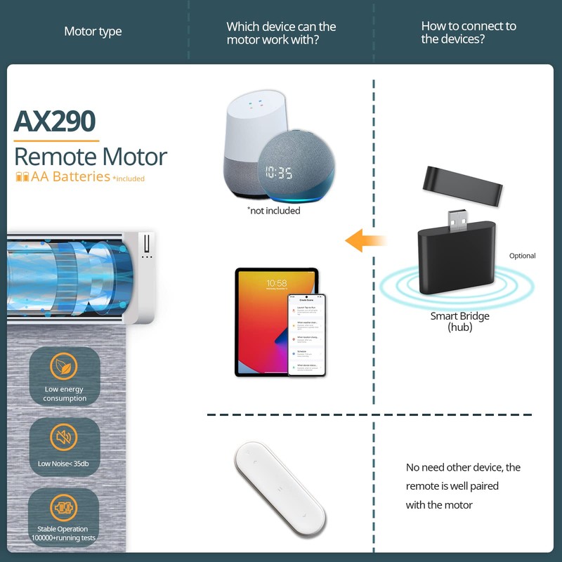 - SMART IMPLEMENTATION: The AX290 motor requires a smart bridge for APP control/voice control, which requires a hub at home, and you may try our hub. All models of Alexa and Google Assistant can be used to control motorized window shades, and can set timers and other scenes