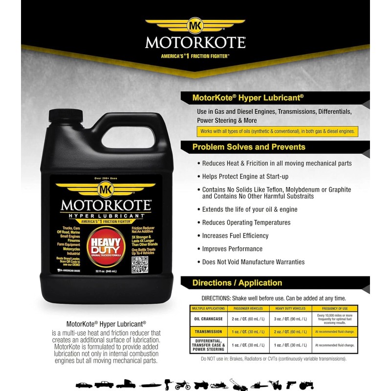 MotorKote Hyper Lubricant is a premium heavy-duty friction fighter formulation that bonds to metal surfaces on contact to reduce heat and friction. Helps extend engine life and fuel economy. Recommended to be used in Engines, transmissions both automatic and manual, power steering systems, differentials, transfer cases, marine engines both inboard & outboard, motorcycles, ATV’s Jet Skis, lawn mowers, gas power tools, snow blowers, firearms, farm equipment and more. It does not require heat to become activated providing protection against dry starts. Contains no solids preventing any clogging of filters. MotorKote can be added at any time, not just fluid changes and is compatible with all motor oils including synthetics. MotorKote does not alter SAE ratings or void warranties and carries a 100 per cent money back guarantee. Works in all gas or diesel engines and other mechanical devices requiring lubrication. Not for use with brakes or brake lines.