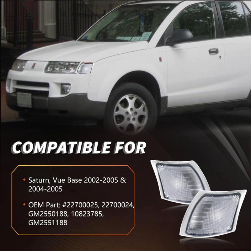 - [Precise Compatibility] MOTRUM Turn Signal Parking Light Cover is perfectly compatible with 2002-2005 & 2004-2005 Saturn, Vue Base, making it an easy and effective upgrade for your ride. Its OEM Part#22700025, 22700024, GM2550188, 10823785, GM2551188 ensures that it is a flawless fit, making your journey safer and brighter. Note: The Bulbs and Sockets are NOT included.