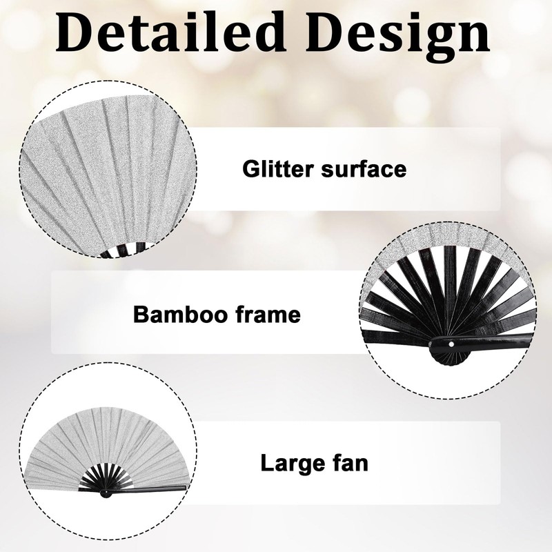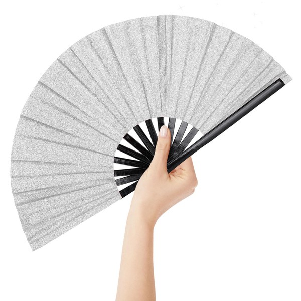 Motthjcw Bamboo Hand Fans, 13 Inch Large Glitter Rhythmic Clack Hand Fans for Women Foldable, Rave Fans for Line Dancing, Rave Accessories for Club Party Dance Festival Essentials (Silver Glitter)
