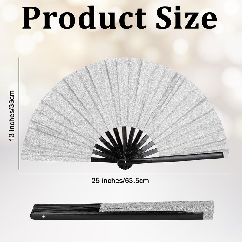 Elevate your dance routines and stay cool with our 13" large glitter folding bamboo fan. This handheld fan blends classic craftsmanship with modern sparkle, it is available in black fan, silver fan, red fan and pink fan.