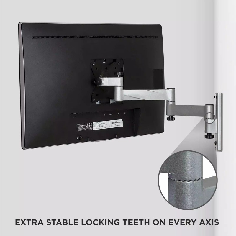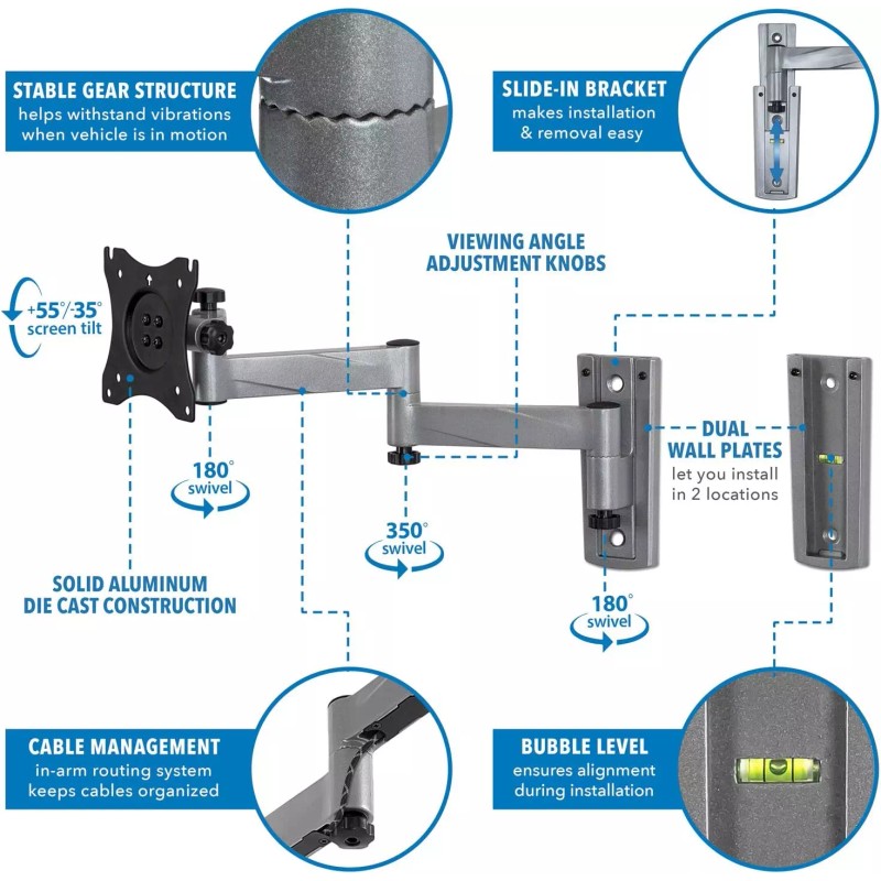 Unique articulating TV wall mount with a locking mechanism that securely holds your TV in place. Ideal for RV or motor home use. Unique gear structure with fixing knob helps TV withstand the vibration in transit.