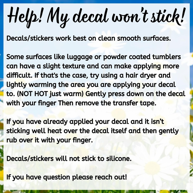 - Decals are perfect for any smooth surface such as car windows laptops, tumblers, phone cases, coolers, lockers, etc. (will not stick to silicone)
