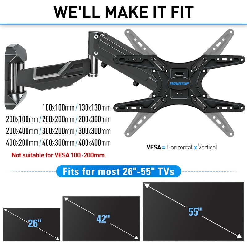 - TV Wall Mount Compatibility: The full motion TV brackets fits most 26-55 inch LED/LCD TVs and large monitors, with 11- 66 lbs. MAX loading and VESA pattern from 100x100 mm to 400x400 mm. This articulating television wall mount is designed for single wood studs or concrete/brick walls and is compatible with TCL, SAMSUNG, LG, VIZIO, SONY, HISENSE, and other TV brands.