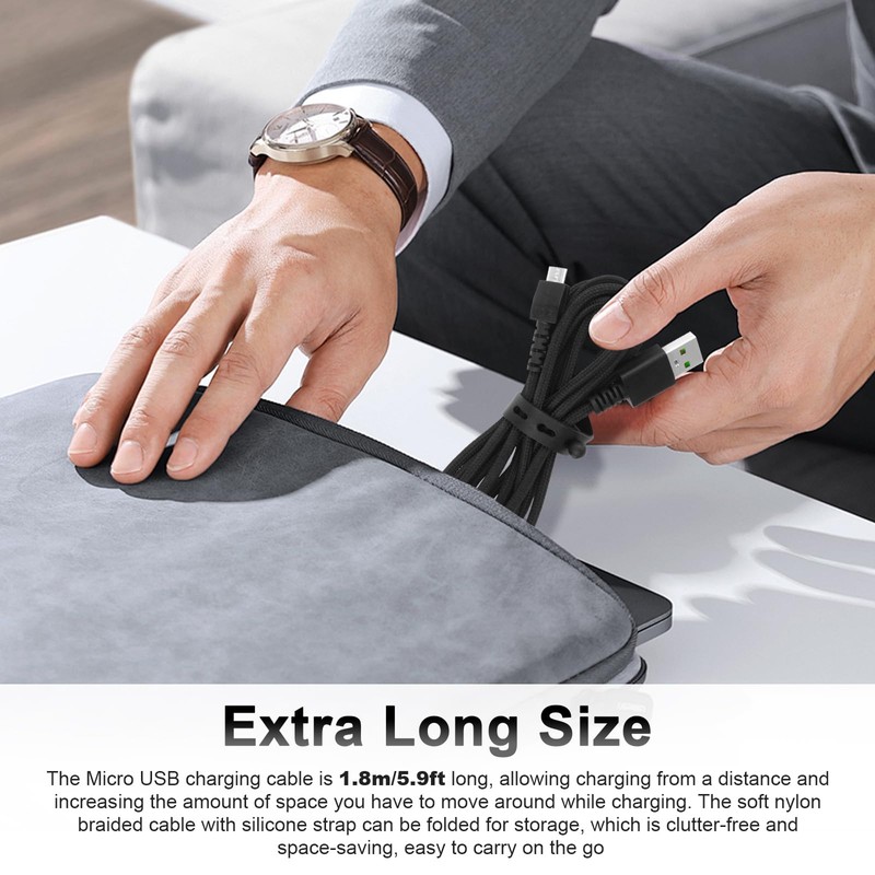 - EXTRA LONG SIZE: The Micro USB charging cable is 1.8m/5.9ft long, allowing charging from a distance and increasing the amount of space you have to move around while charging. The soft nylon braided cable with silicone strap can be folded for storage, which is clutter-free and space-saving, easy to carry on the go.