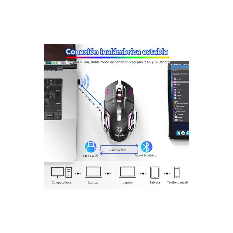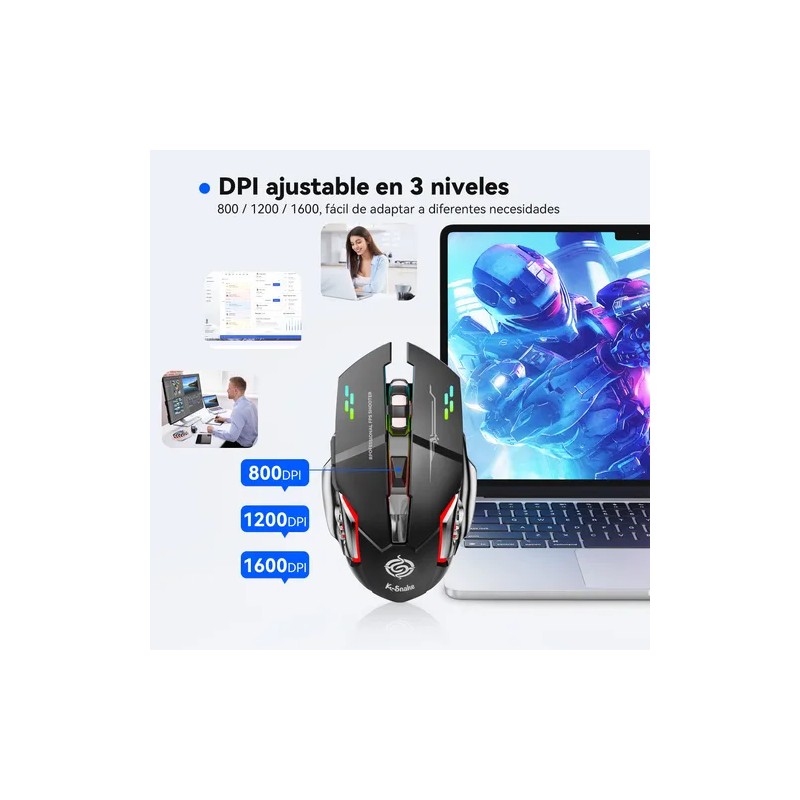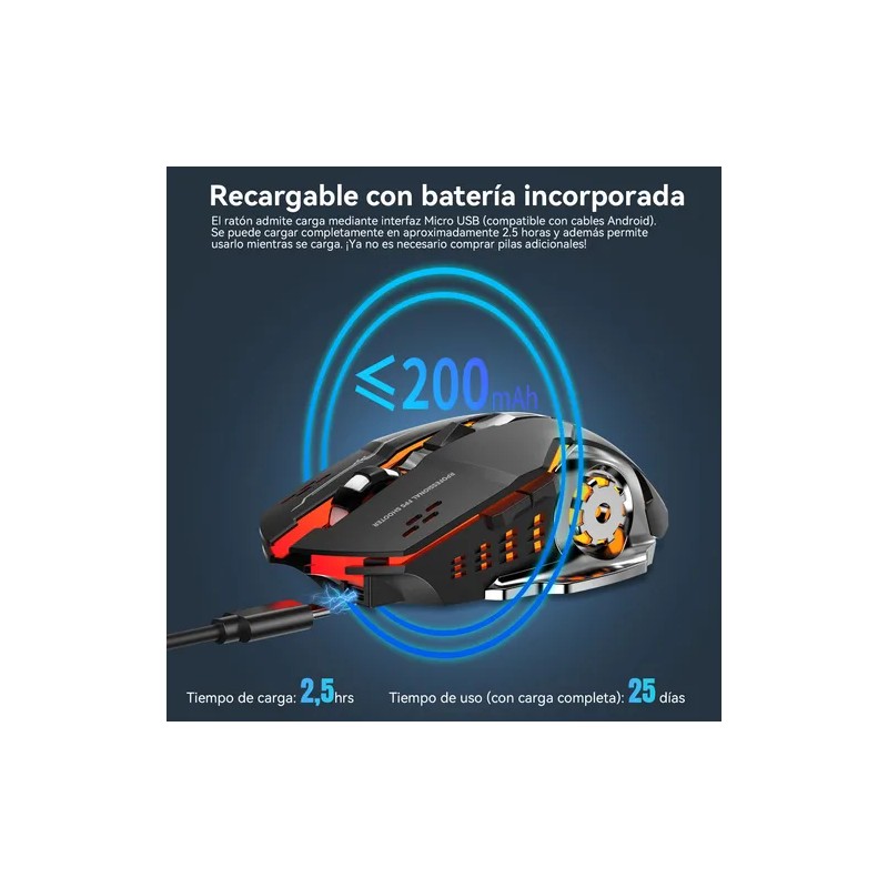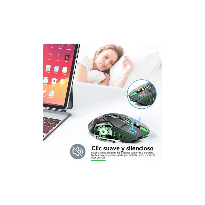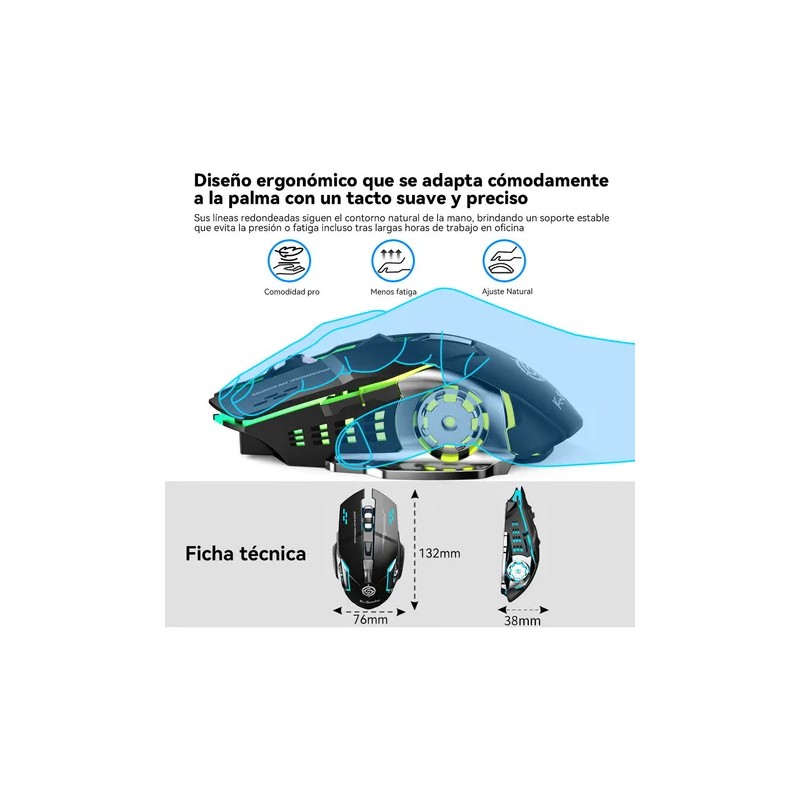 Equipado con batería de litio recargable por USB, este mouse ofrece varios días de uso con una sola carga. Además, cuenta con iluminación LED multicolor que se activa automáticamente durante su uso, brindando un toque moderno y vibrante a tu escritorio.