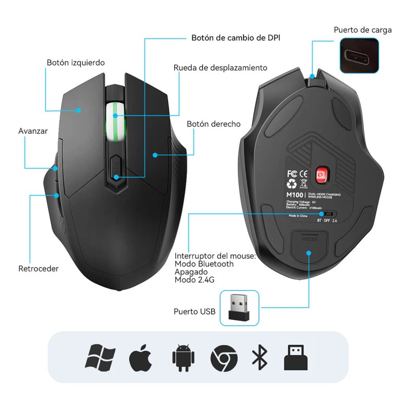 Mouse Inalámbrico M100 Ratón Bluetooth + 2.4g Recargable Silencioso Ergonómico Dpi Ajustable