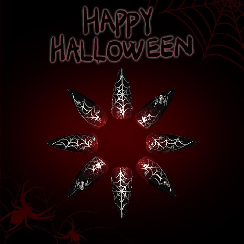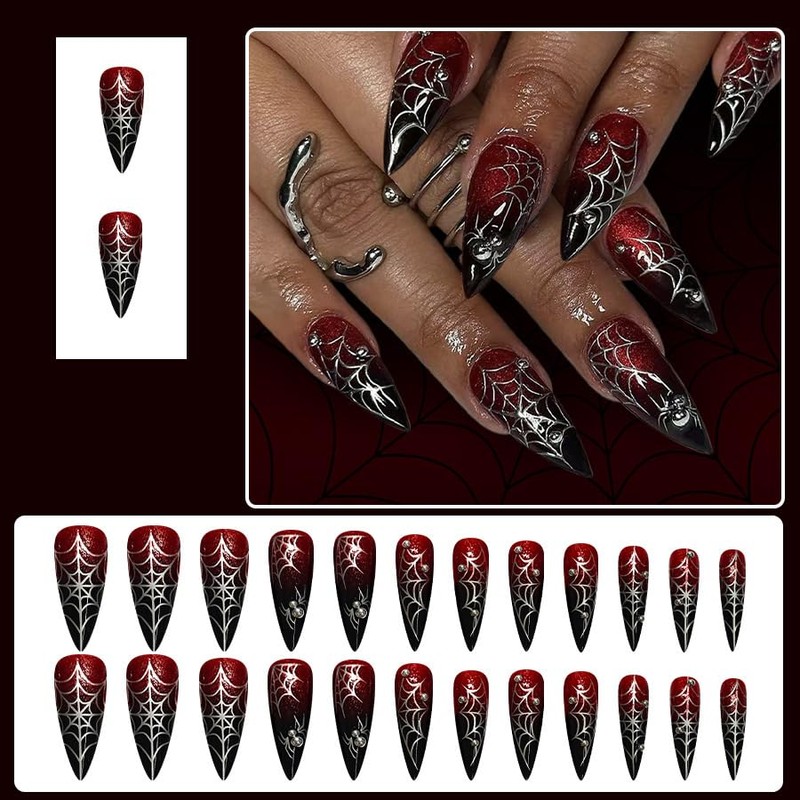 MouyouGlow Press on Nails Lang,Stiletto Halloween Rot Gradient Schwarz Spinnennetz 3D Silber Spinnen Crytsal Horror Spooky Gothic Fake Nails mit Nagelkleber,Ret Ombre Black Künstliche Fingernägel