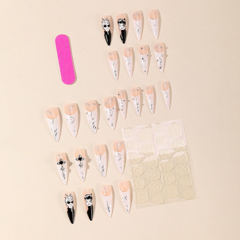 MouyouGlow Press on Nails Long, Stiletto Nude White French 3D Cross Charms Heart Rhinestone su gu ru Ge to Wavy Cartoon Gothic Fake Nails with Nail Glue, White Tip Acrylic Artificial Fingernails