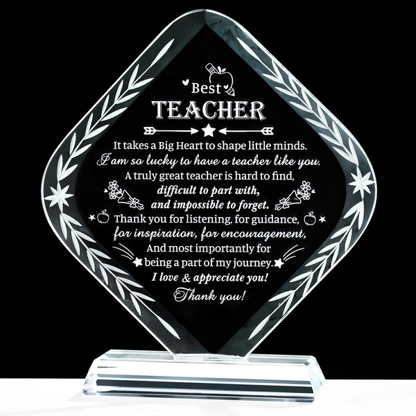 - 【Size and Material】 Size: 17 * 4.2 * 20cm/6.7 * 1.7 * 7.9 inches These crystal teacher plaques are made of K9 crystal material with high refractive index and transparency, which is crystal clear and designed in a diamond shape. It is atmospheric and beautiful, and uses laser engraving technology to engrave warm text and cute elements, which will never fade and is durable. The crystal material determines the advantage of this teacher's gift decoration being easy to clean. Express your sincere love and gratitude for the teacher's patient help and guidance
