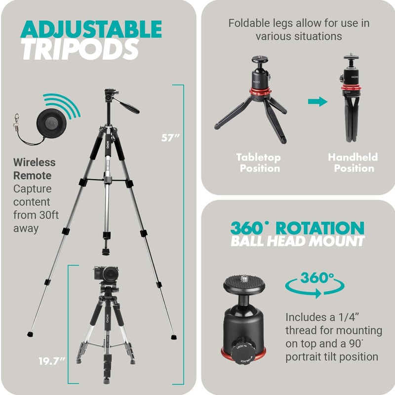 - Portable Tabletop and Full-Sized Tripods: Set up your vlogging station anywhere with our compact and reliable tripods, perfect for on-the-go content creators