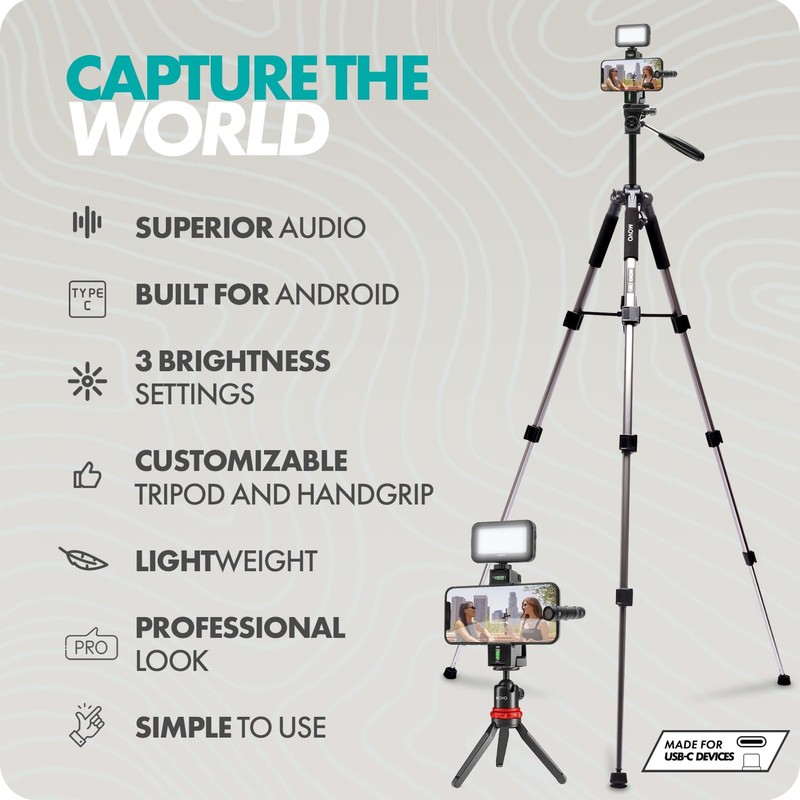 Movo uVlog-Interview Android Vlogging Kit for Interviews w/Full Tripod: USB-C YouTube Starter Kit with DoubleMic, Phone Mount, Tabletop Tripod, and Light – Ideal Content Creator Kit for Android