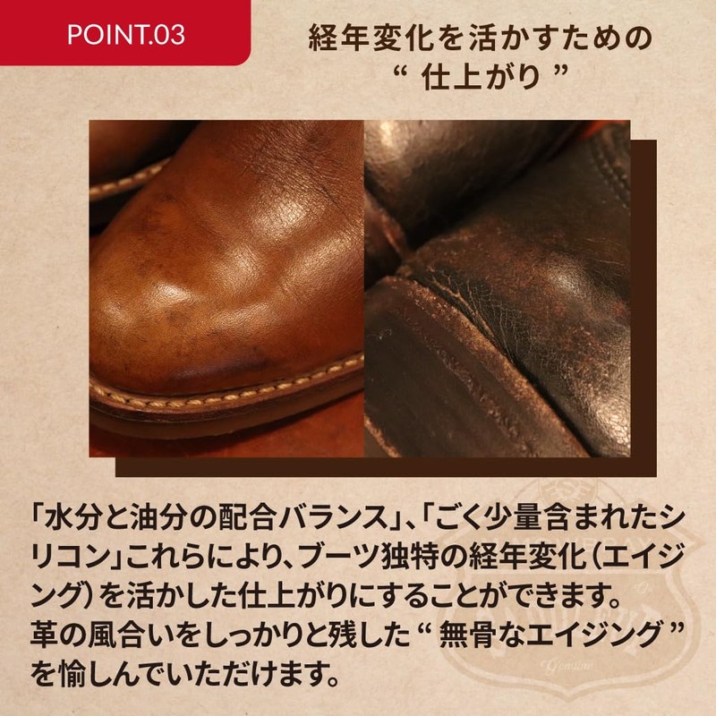 - Care cream for aging boots with carnauba wax and oil. For those who want to use "rugged aging" that will leave the texture of the leather that has changed over time, we recommend Engineer Black, Black Cherry and Cigar Brown. Neutrals are recommended for those who want to enjoy the loss of leather or aging of tea wicks. This cream has a supplementary color, nourishment and shine and is virtually unaffected by the moisture absorption and breathability of the leather