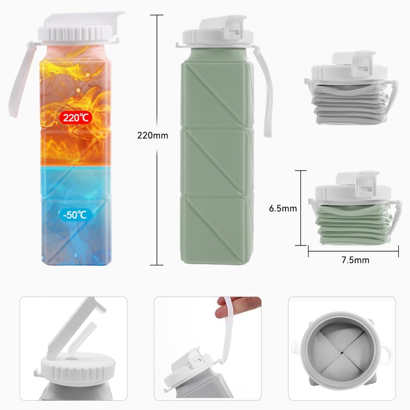 - Vaso de Agua Resistente Frío & Calor: Esta botella de agua de silicona es resistente a bajas y altas temperaturas de -50 °C a 220 °C. Sin embargo, por su seguridad, no se recomienda llenarlo con líquido demasiado frío o demasiado caliente para evitar lesiones cuando sostenga la botella. Si la taza está abultada debido a bebidas carbonatadas o calientes, no la apriete y tenga cuidado al abrir la tapa