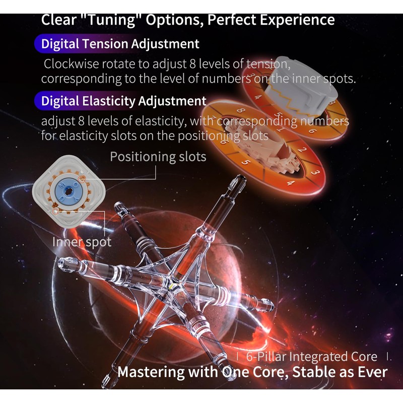 • Núcleo integrado de 6 pilares: el núcleo integrado de nuevo diseño se puede llamar el marco del cubeta, proporcionando no solo un soporte estable, sino que también conecta firmemente el sistema central de doble ajuste, haciendo que el cubeta sea más apretado, afinando más conveniente y acelerando más estable.