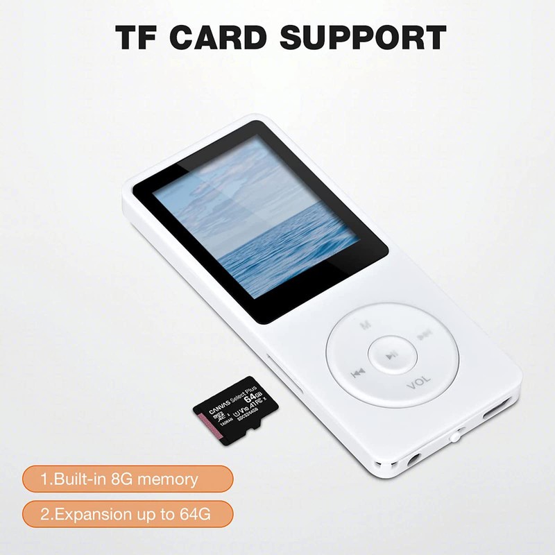 - LARGE CAPACITY With 8GB built-in flash memory, this MP3 player can store up to 1500 songs. The memory card slot supports 64GB large micro SD cards.