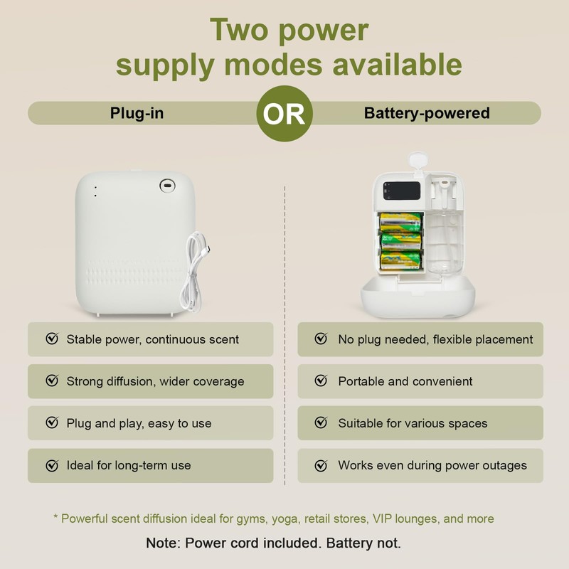 - Dual Power Options, USB Continuous Power: If you prefer not to use batteries, our scent air machine for home also supports USB power (USB cable included), offering a continuous power supply and eliminating the need to replace batteries. Simply plug in the USB cable in your office or home for a long-lasting fragrance experience.