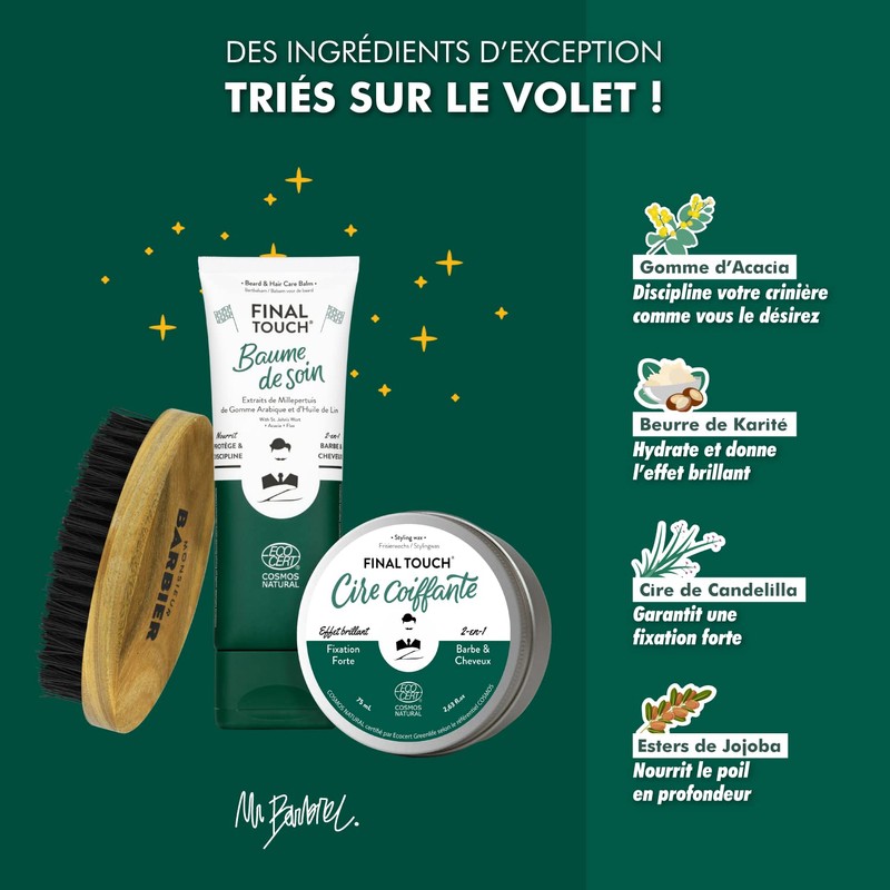 - Final touch: the styling balm deeply nourishes the hair while providing a light natural structure. The styling wax gives you a mastered look all day long thanks to its strong fixation and the vegan sandalwood brush detangles your mane under all circumstances