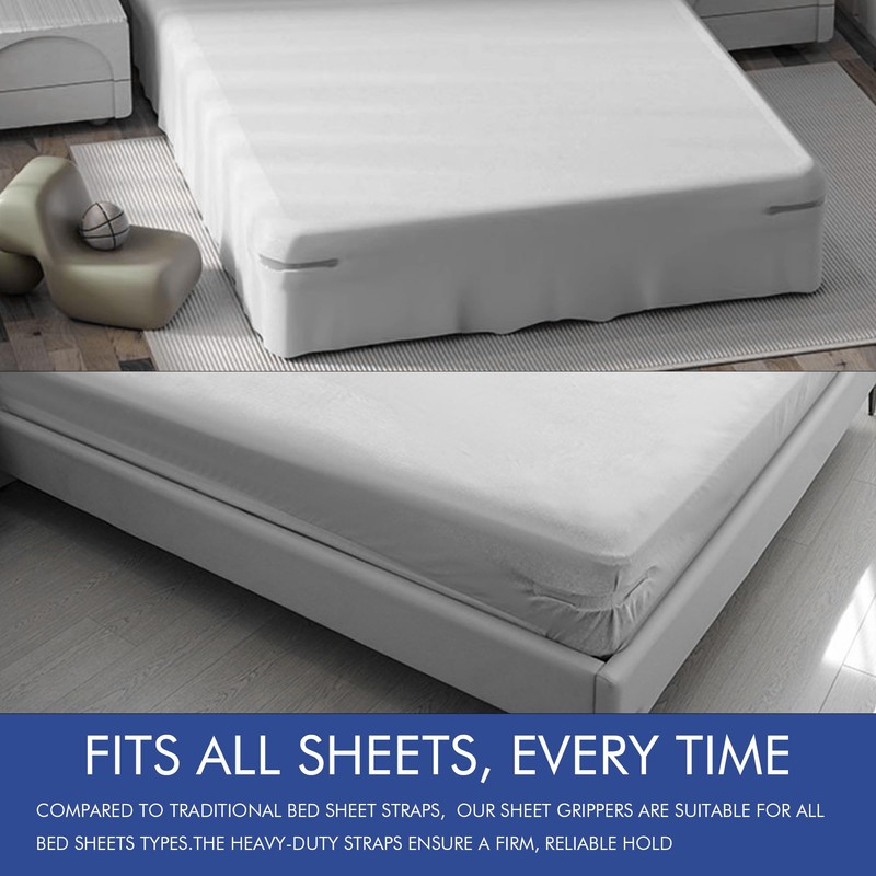- Our bed sheet straps are universal Fit for All Mattress Sizes: Whether you have a Twin, Full, sheet straps for queen size bed, bed sheet straps king, or even custom bed, these sheet clips adjust to fit securely. They’re compatible with most mattress types, including memory foam and pillow tops