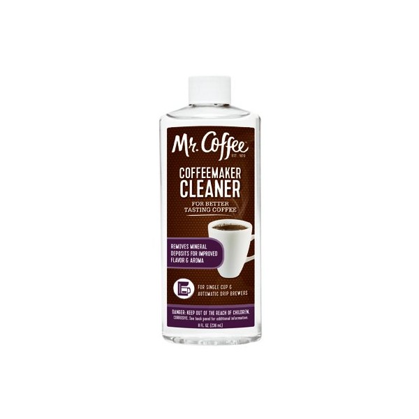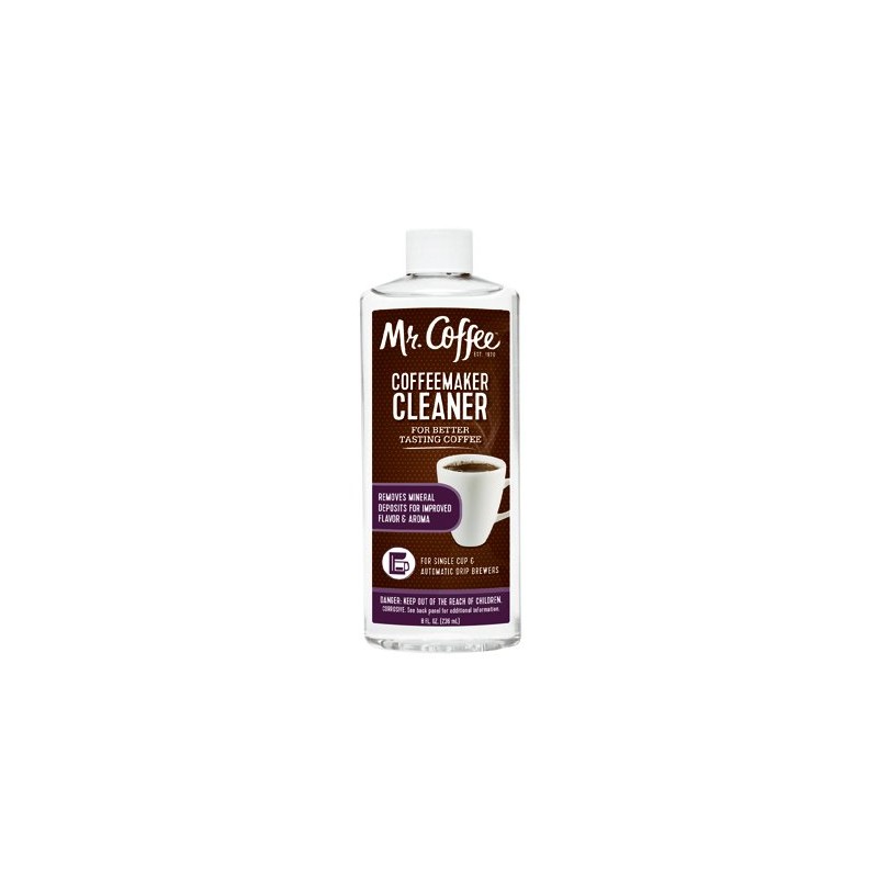 Features. Mr. Coffee 8 oz. Coffeemaker Cleaner.. Removes Lime Calcium Other Hard Water Deposits To Improve Brewing Time Provide Better Tasting Coffee.. Cleans Better Than Vinegar With No Unpleasant Odors.. For Use For Automatic Drip Single Serve Coffeemakers.. Dimension - 1.5 x 2.5 x 7 in.. Item Weight - 0.7 lbs.