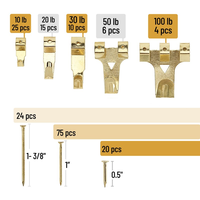 - Heavy Duty Picture Hanger Hooks Are Rated At 10lb, 20lb, 30lb, 50lb, 100lbs. They Are Matched Perfectly With The Nails In The Box, Making It Easy To Hang Pictures Of Different Sizes On The Wall.