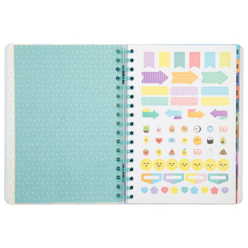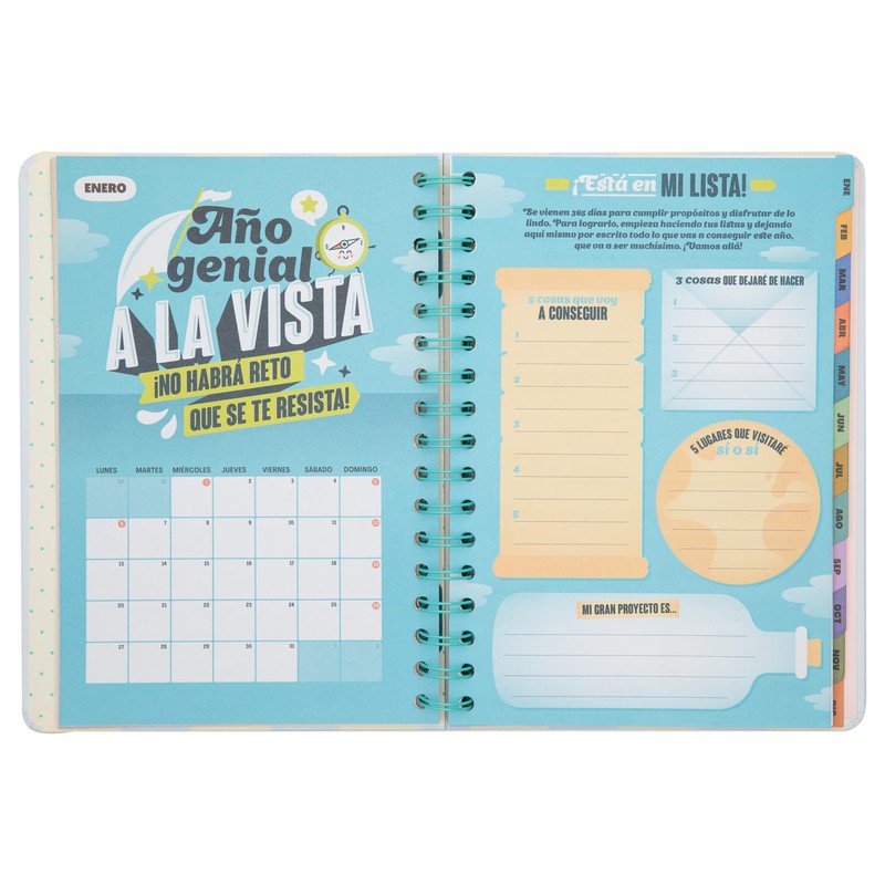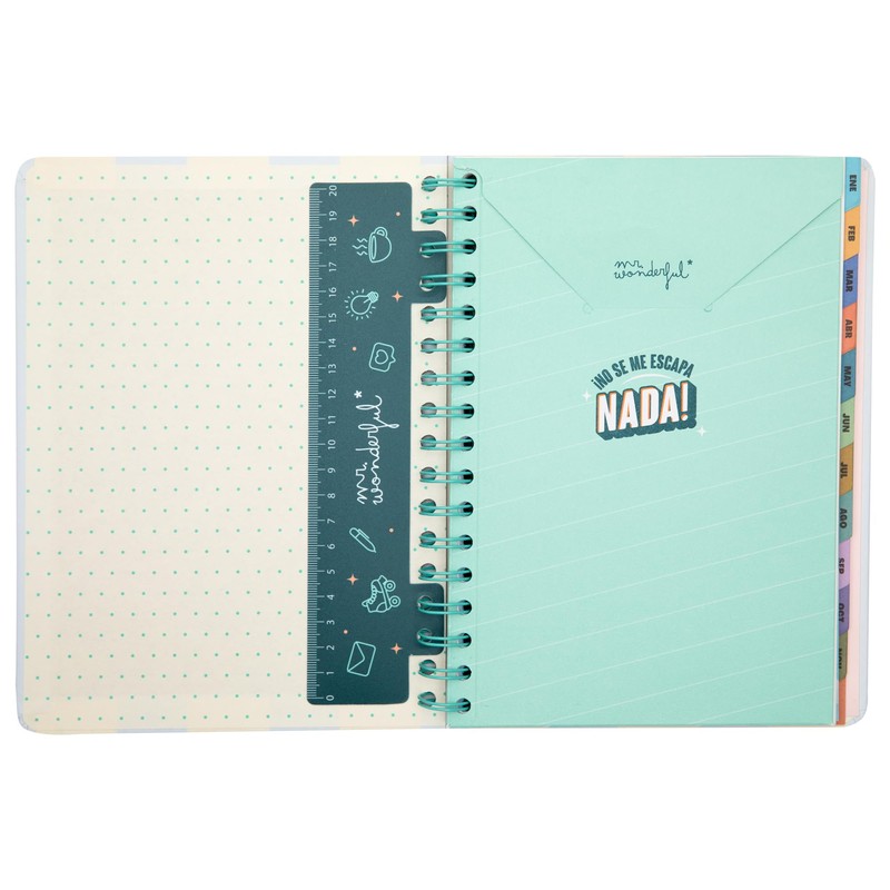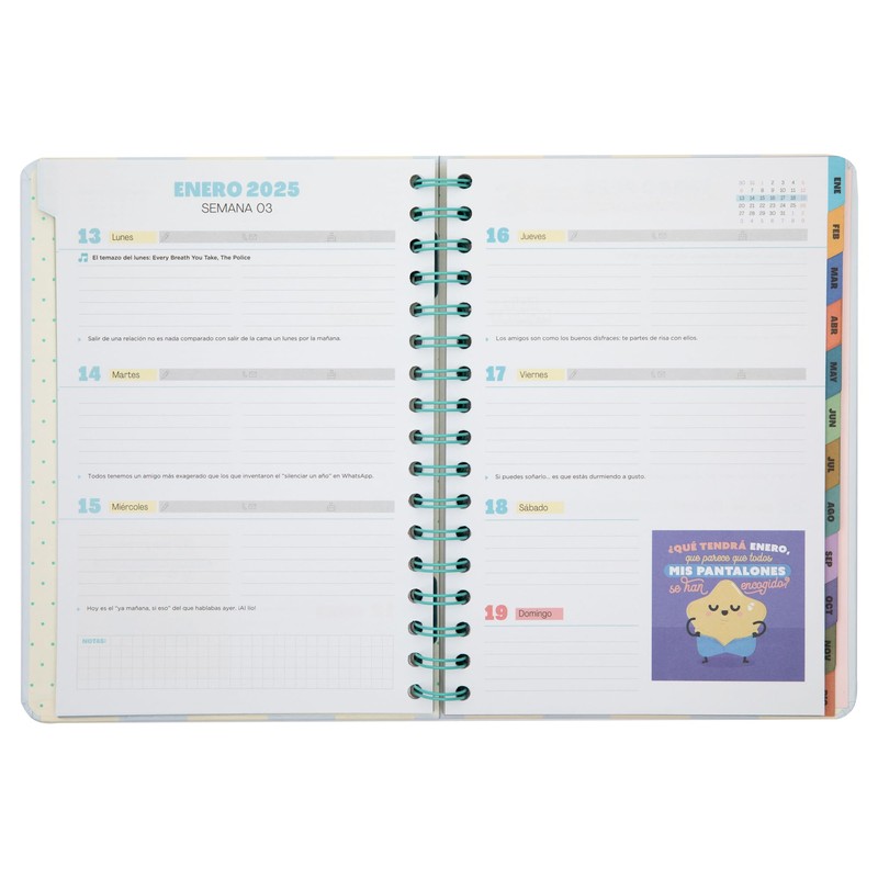 - Plastic ruler inside. 8 sticker sheets. Very fun games and extras. Full times and calendars for 2025 and 2026. Playlist exclusive. Pages for noting contacts. Savings board closure with elastic band.